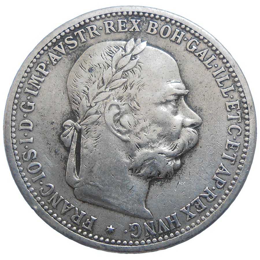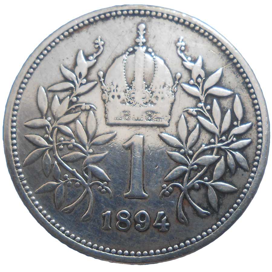 Stará, strieborná, obehová minca Františka Jozefa I. v hodnote 1 koruny z roku 1894.