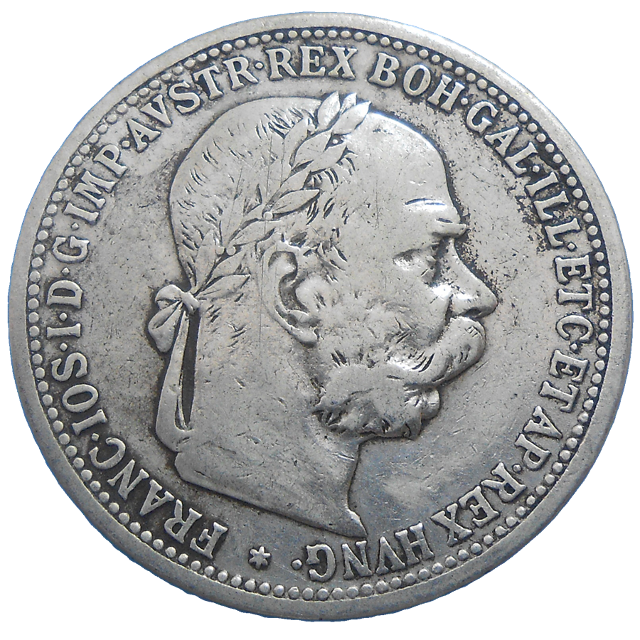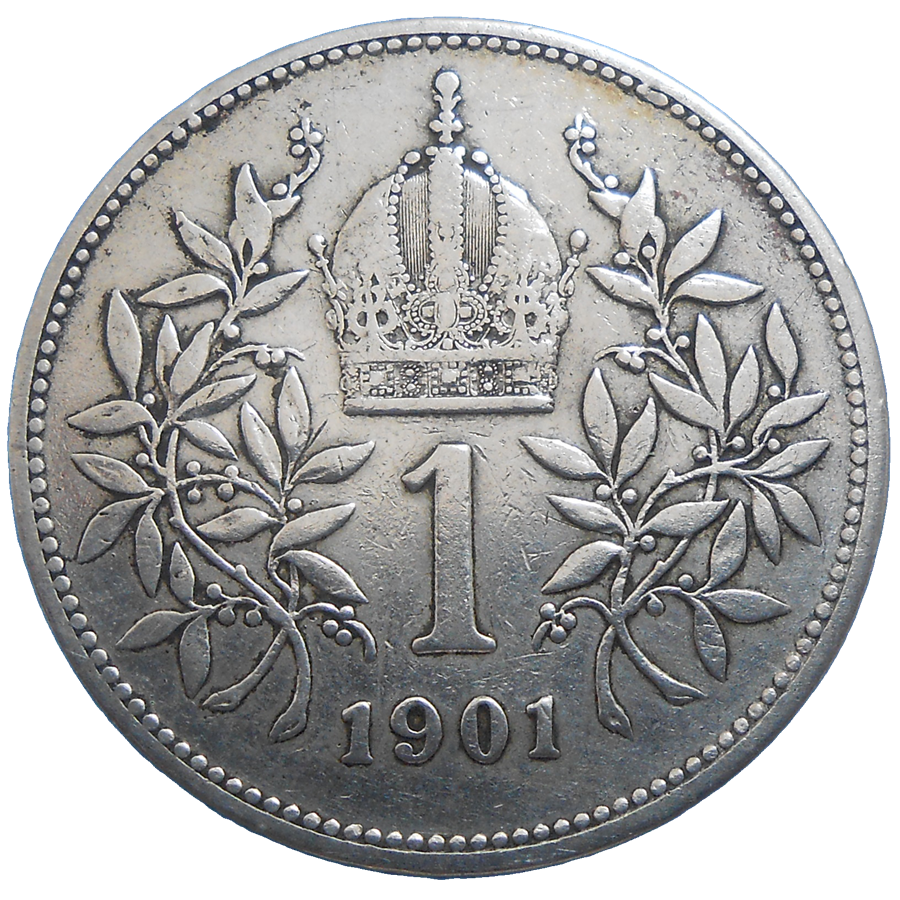 Stará, strieborná, obehová minca Františka Jozefa I. v hodnote 1 koruny z roku 1901.