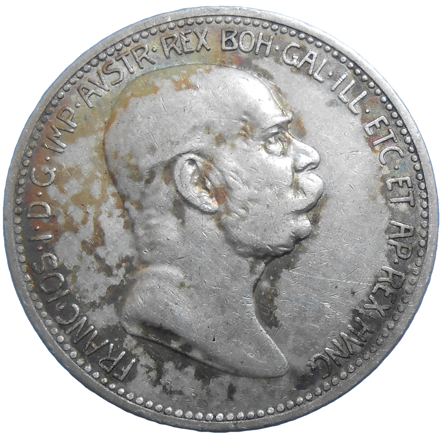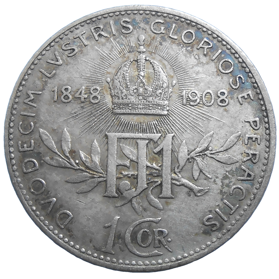 Stará, strieborná, pamätná minca Františka Jozefa I. v hodnote 1 koruny z roku 1908, vydaná pri príležitosti 60. výročia vlády Františka Jozefa I.