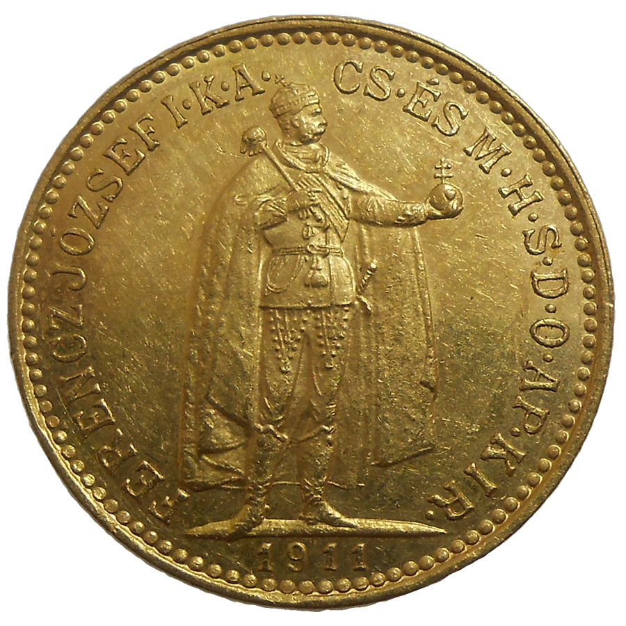 Stará, zlatá, obehová minca Františka Jozefa I. v hodnote 10 korún z roku 1911.