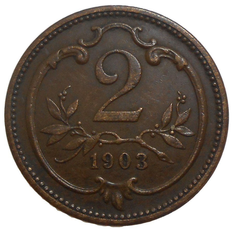 Stará, bronzová, obehová minca Františka Jozefa I. v hodnote 2 Helleru z roku 1903.