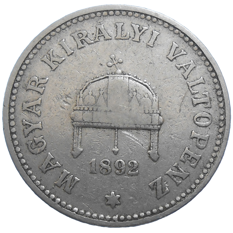 Stará, niklová, obehová minca Františka Jozefa I. v hodnote 20 Fillérov z roku 1892.