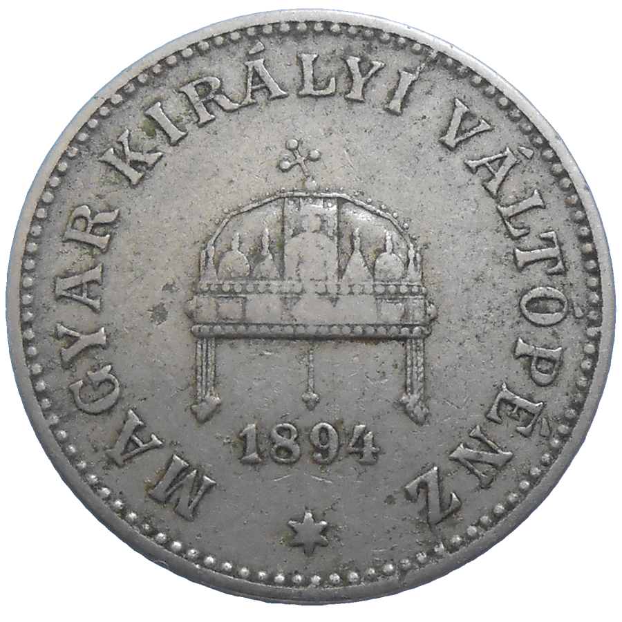Stará, niklová, obehová minca Františka Jozefa I. v hodnote 20 Fillérov z roku 1894.