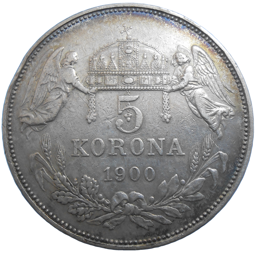 Stará, strieborná, obehová a pamätná minca Františka Jozefa I. v hodnote 5 Korún z roku 1900.