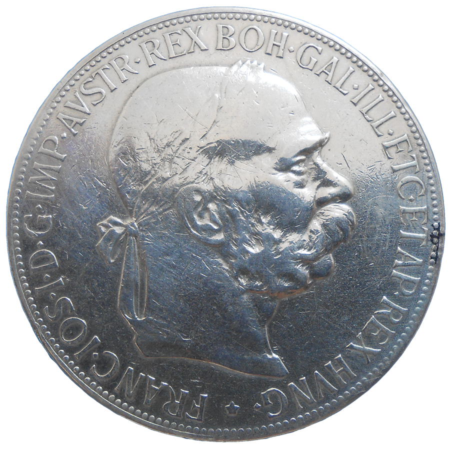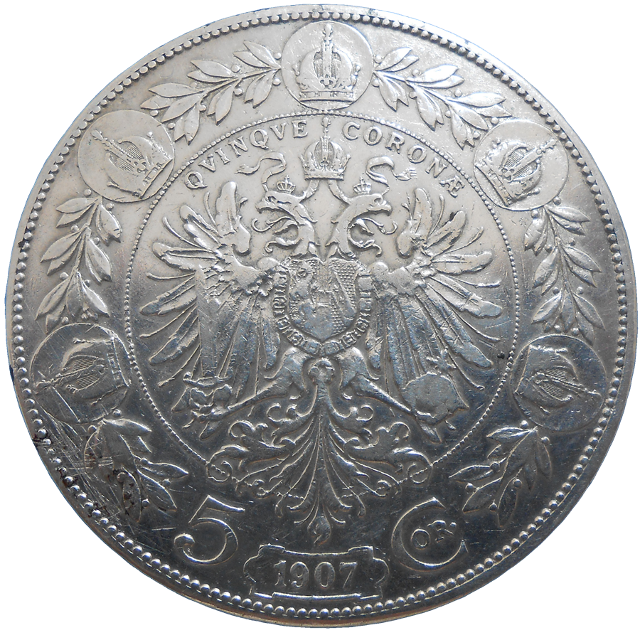 Stará, strieborná, obehová a pamätná minca Františka Jozefa I. v hodnote 5 Korún z roku 1907.
