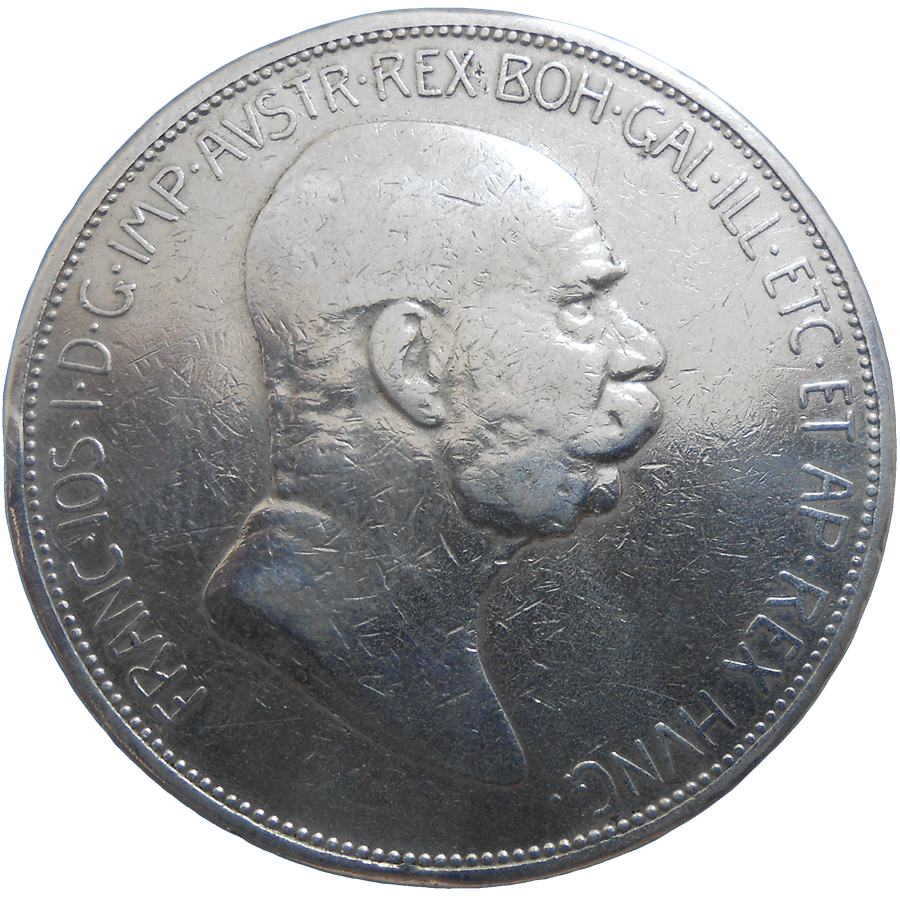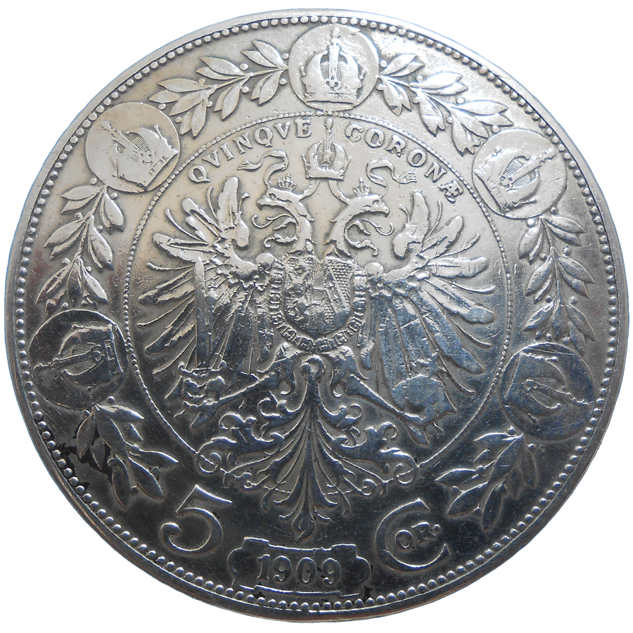 Stará, strieborná, obehová a pamätná minca Františka Jozefa I. v hodnote 5 Korún z roku 1909.