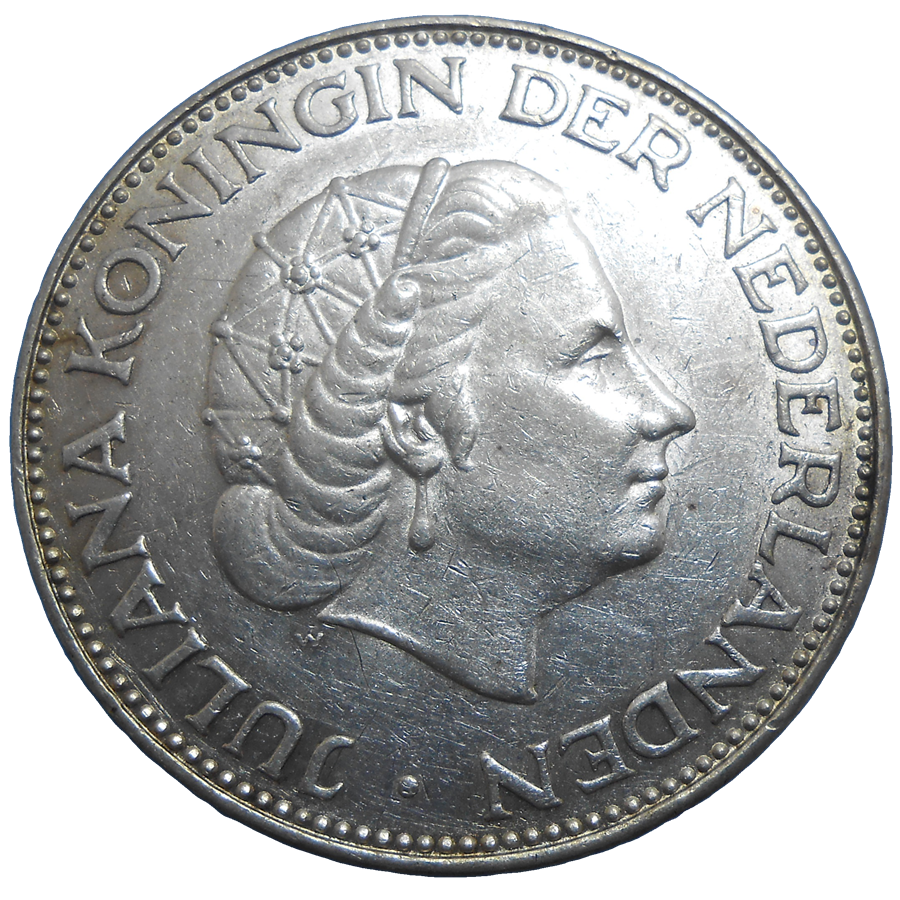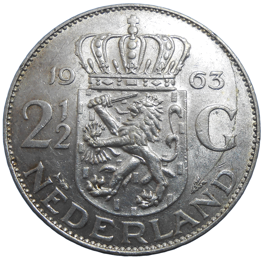 Stará, strieborná, obehová minca Holandska v hodnote 2 1/2 Guldenu z roku 1963.
