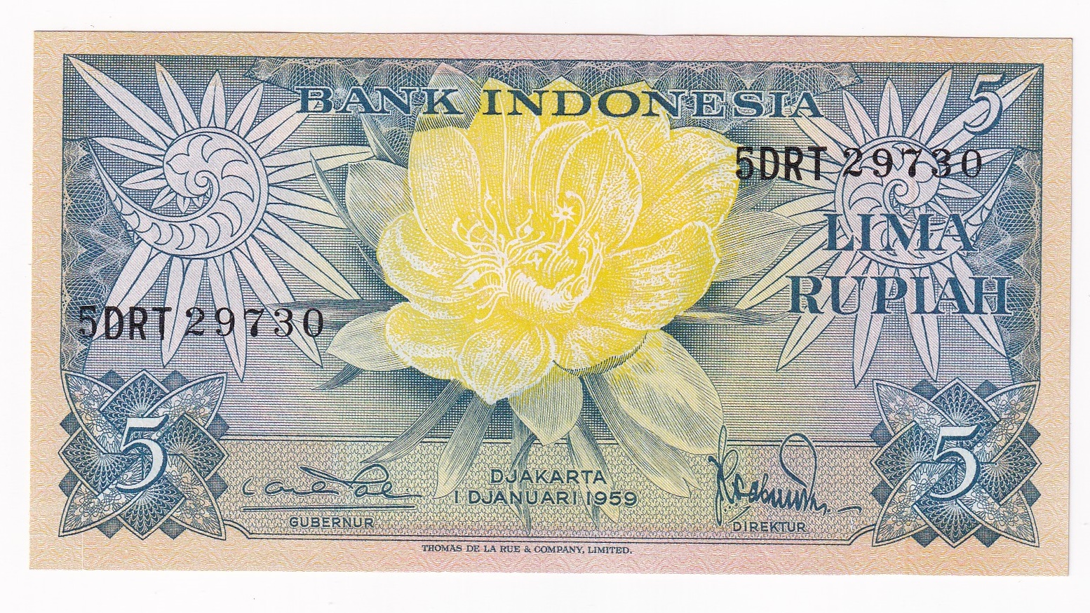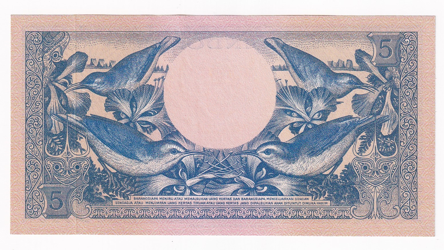 Stará, obehová bankovka Indonesie v hodnote 5 Rupiah z roku 1959.