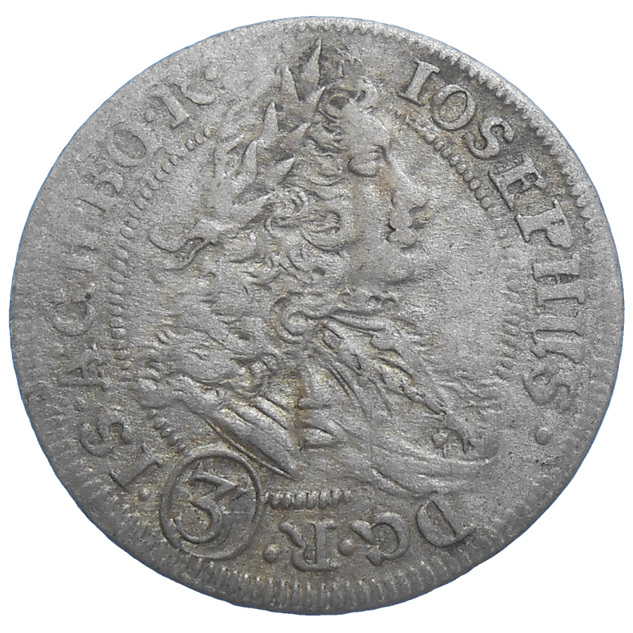 Stará, strieborná, obehová minca Jozefa I. Habsburského v hodnote 3 grajciarov z roku 1706.