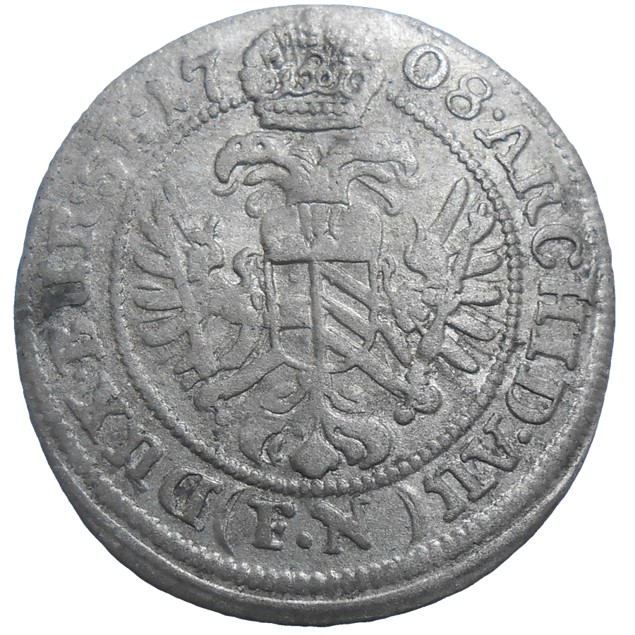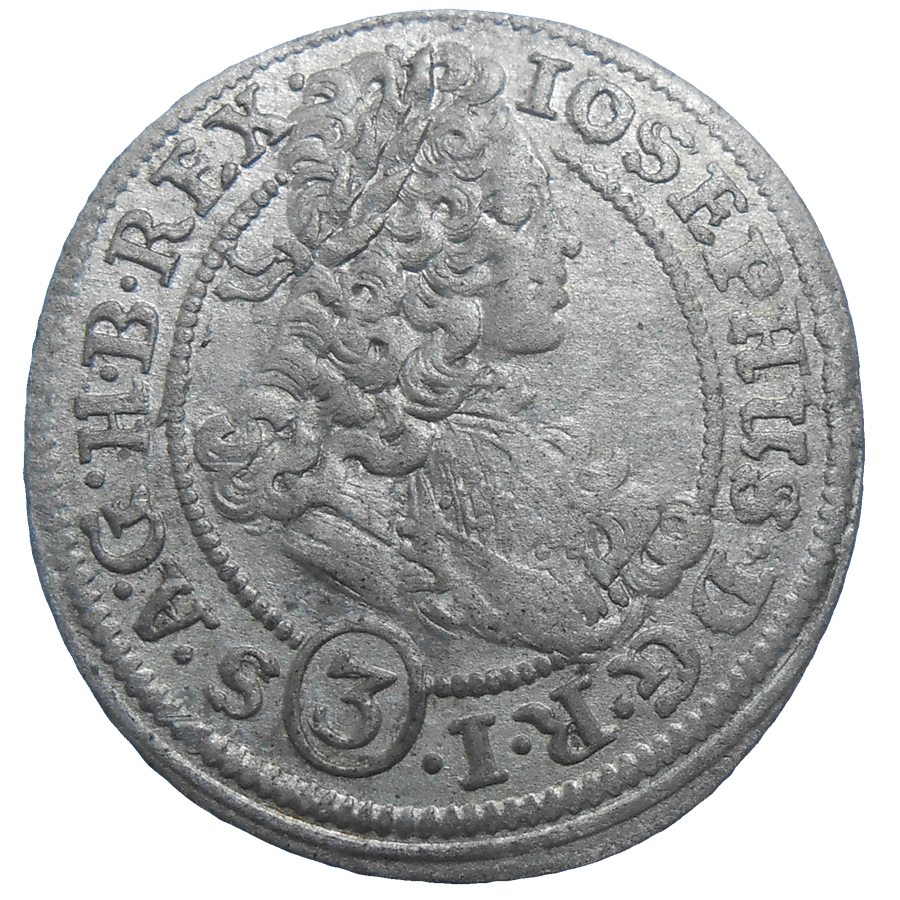 Stará, strieborná, obehová minca Jozefa I. Habsburského v hodnote 3 grajciarov z roku 1708.