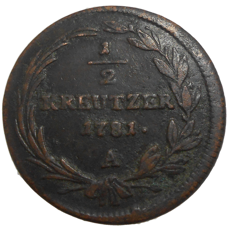 Stará, medená, obehová minca Jozefa II. v hodnote 1/2 grajciaru z roku 1781.