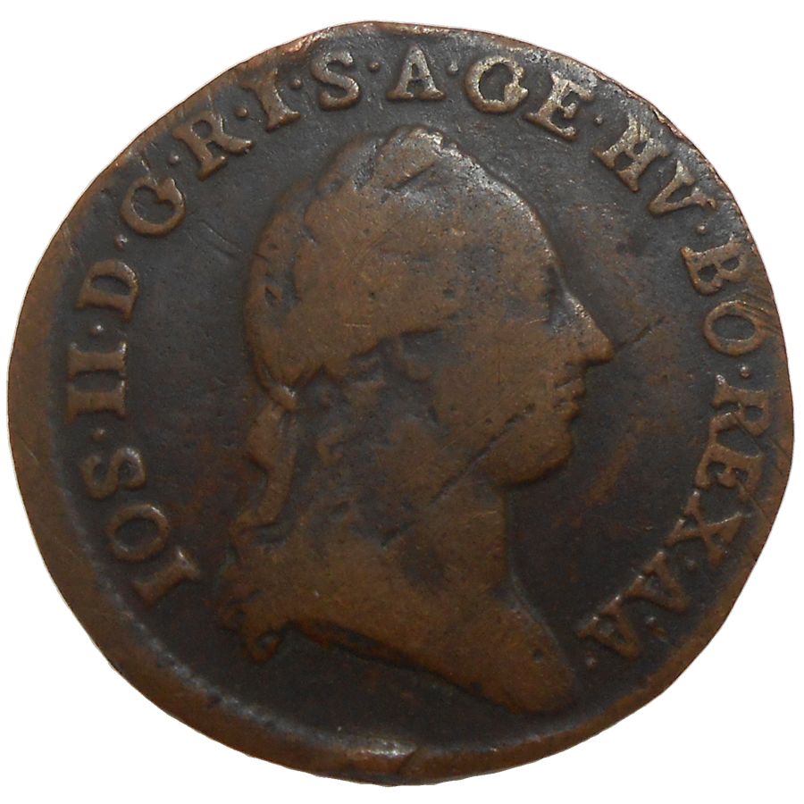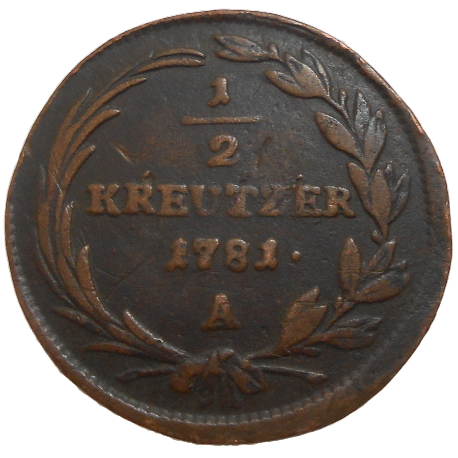 Stará, medená, obehová minca Jozefa II. v hodnote 1/2 grajciaru z roku 1781.