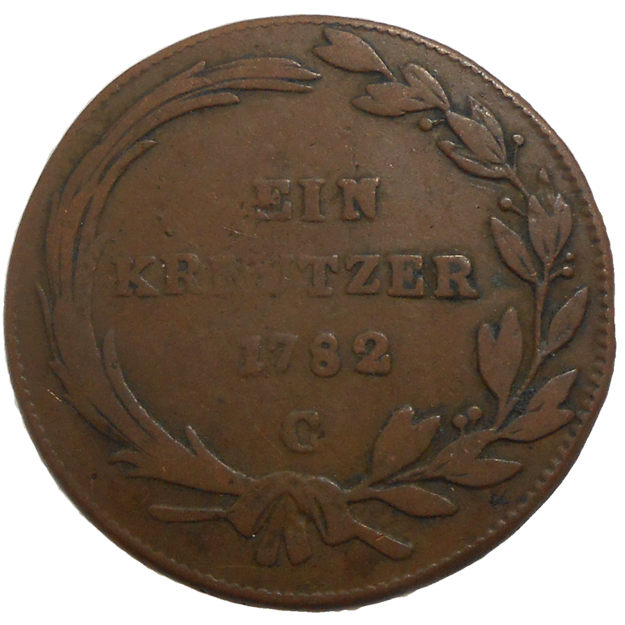 Stará, medená, obehová minca Jozefa II. v hodnote 1 grajciaru z roku 1782.