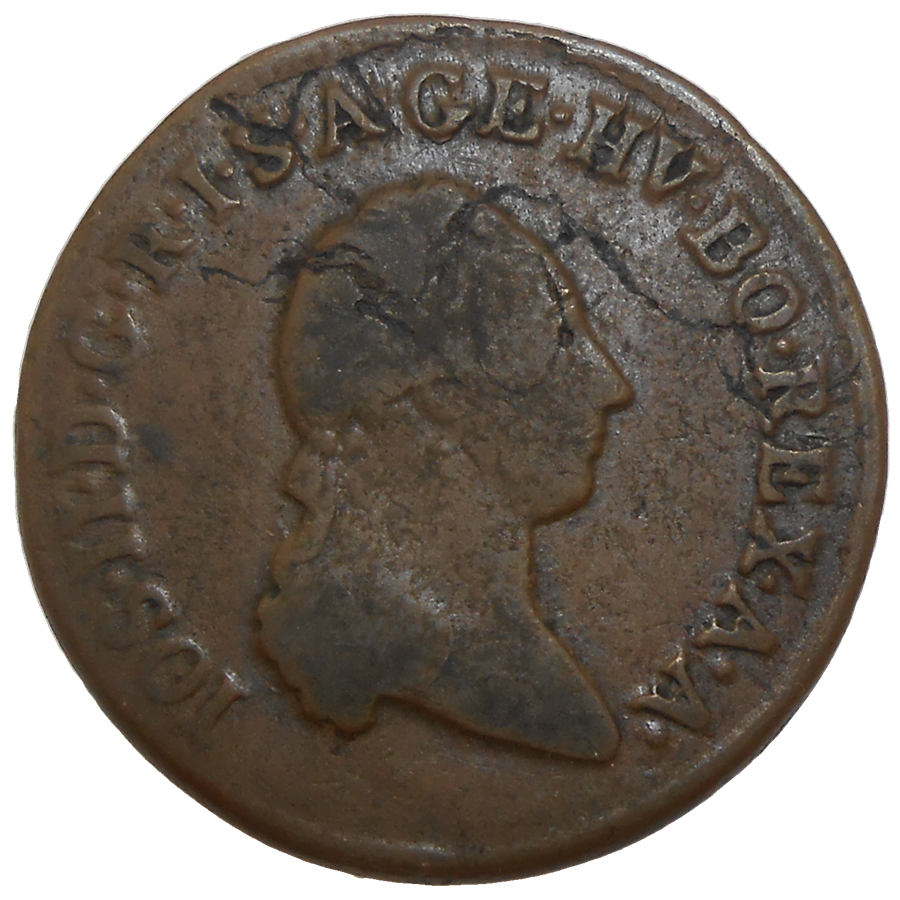 Stará, medená, obehová minca Jozefa II. v hodnote 1 grajciaru z roku 1790.