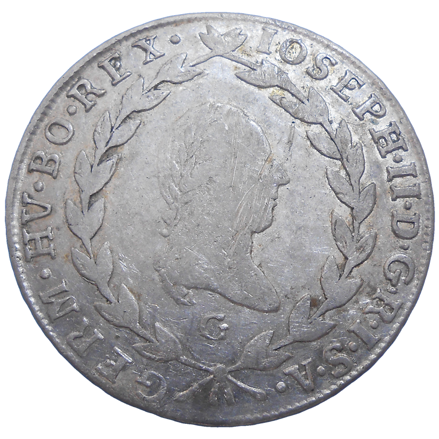Stará, strieborná, obehová minca Jozefa II. v hodnote 20 grajciaru z roku 1789.