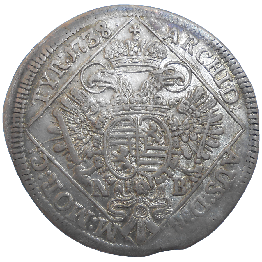 Stará, strieborná, obehová minca Karola IV. Habsburského v hodnote 1/4 toliaru z roku 1738.