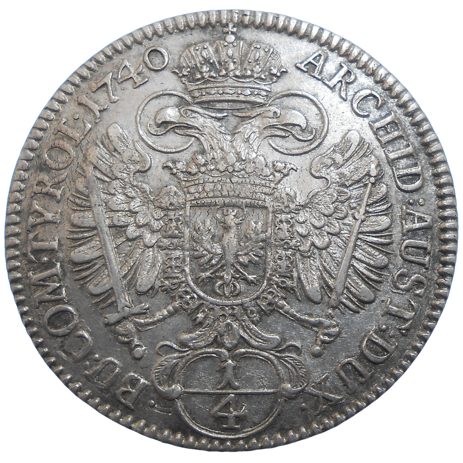 Stará, strieborná, obehová minca Karola IV. Habsburského v hodnote 1/4 toliaru z roku 1740.