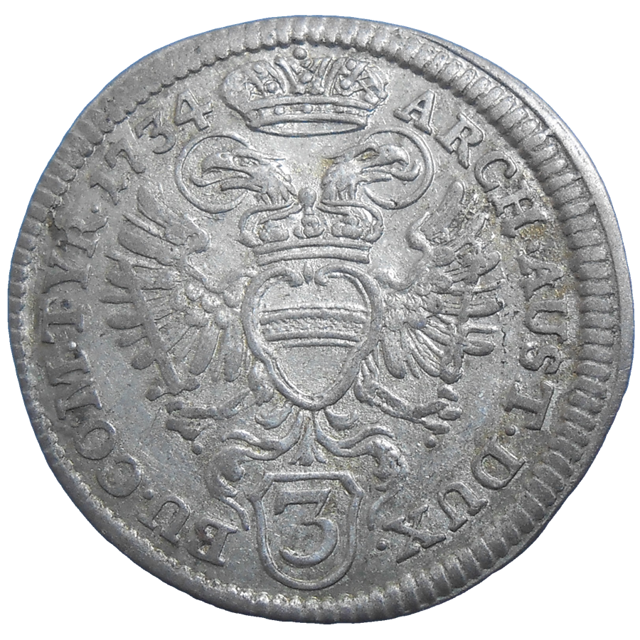 Karol VI. 3 grajciar 1732. Stará, strieborná, obehová minca Karola VI. Habsburského v hodnote 3 grajciaru z roku 1732 - Numizmatický obchod