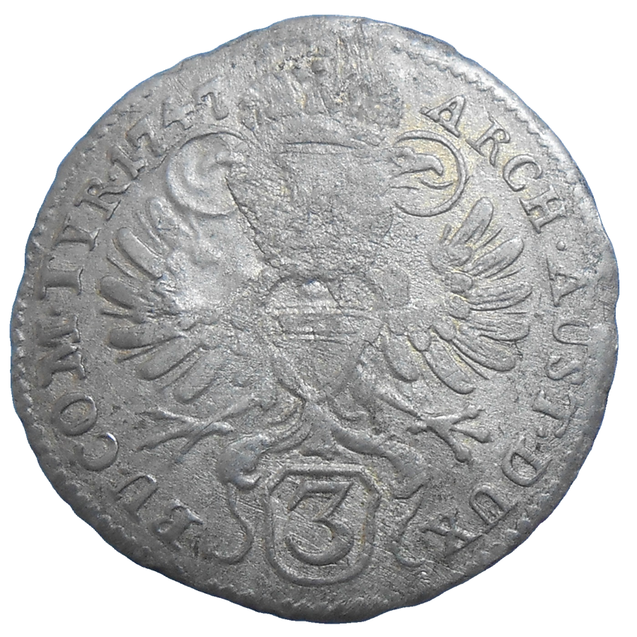 Stará, strieborná, obehová minca Karola VI. Habsburského v hodnote 3 grajciarov z roku 1747.
