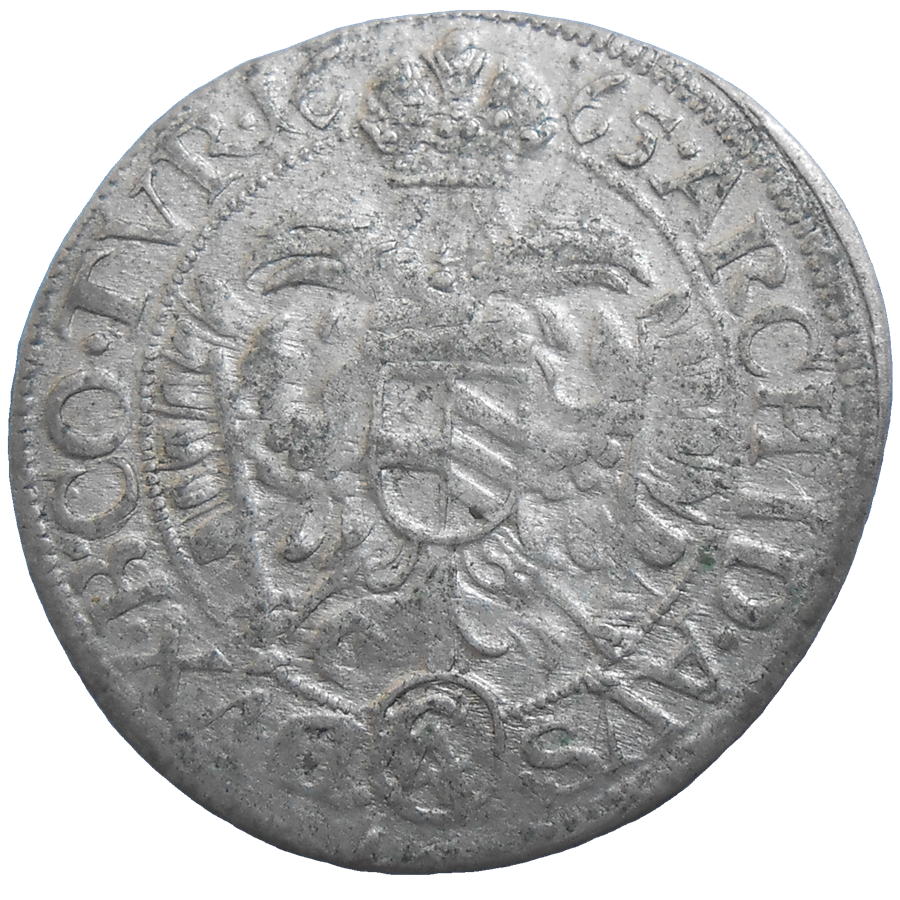 Stará, strieborná, obehová minca Leopolda I. Habsburského v hodnote 3 grajciaru z roku 1665.