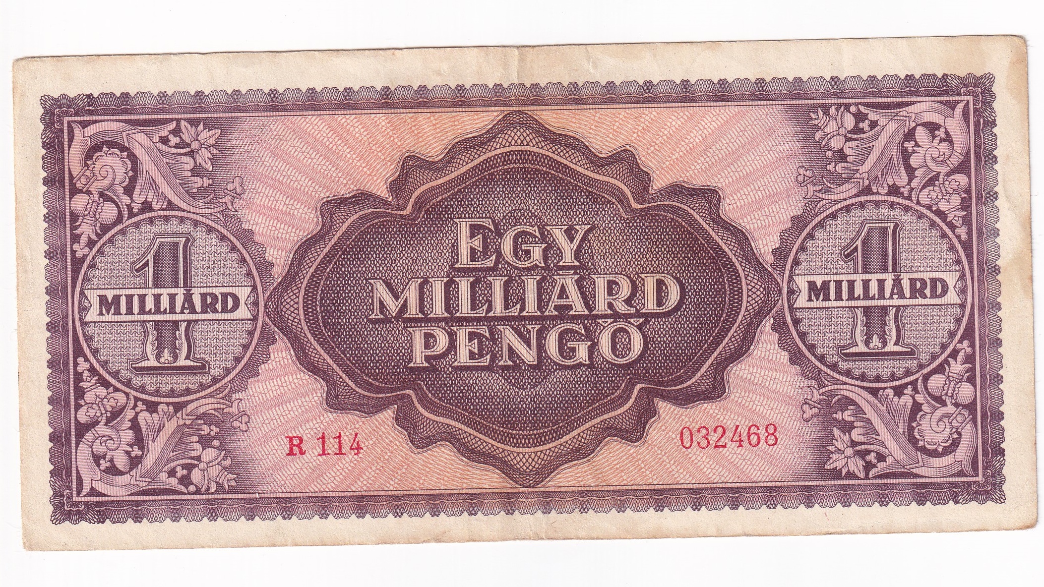 Stará, obehová bankovka Maďarska v hodnote 1 miliardy pengo z roku 1946.