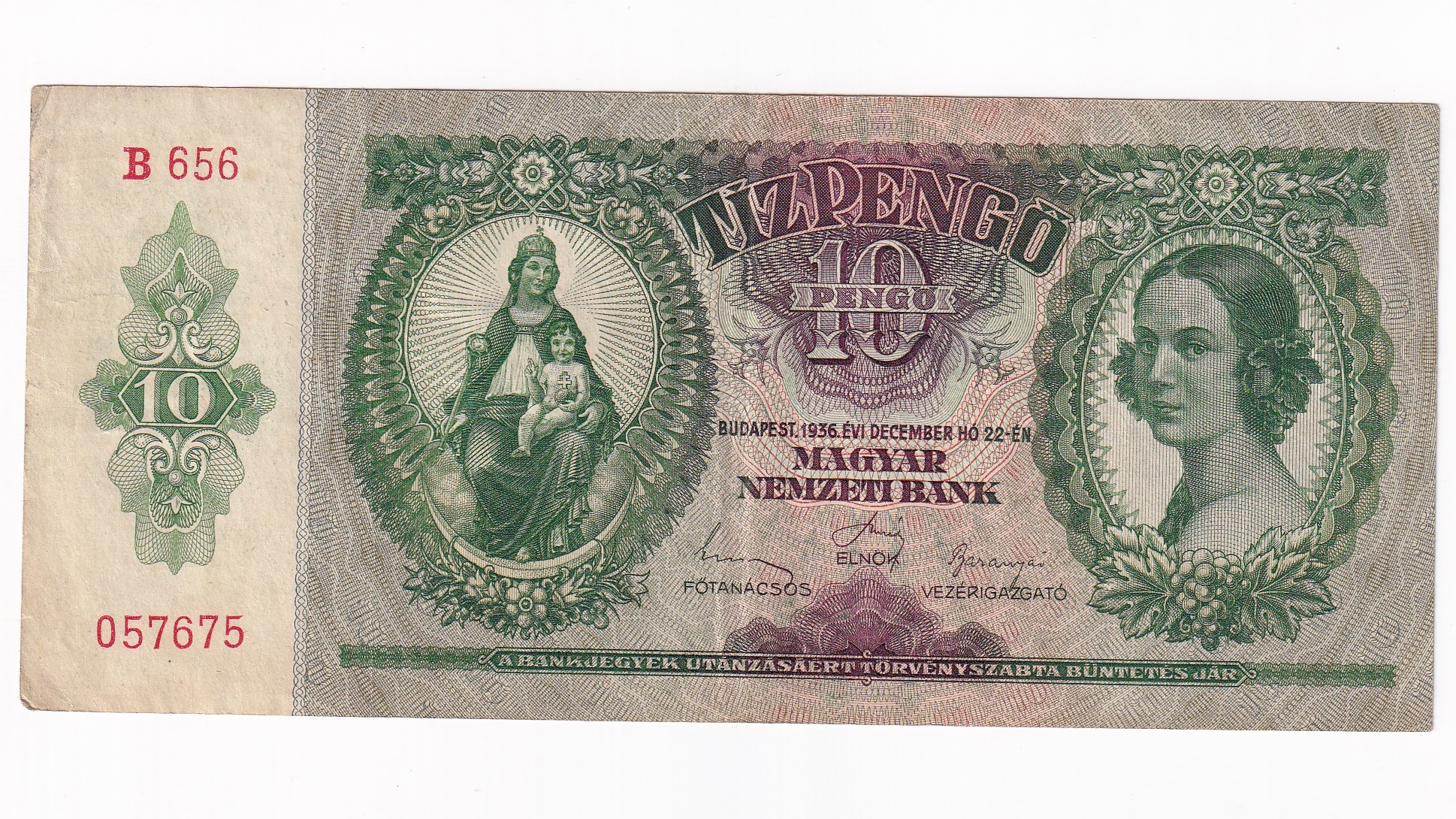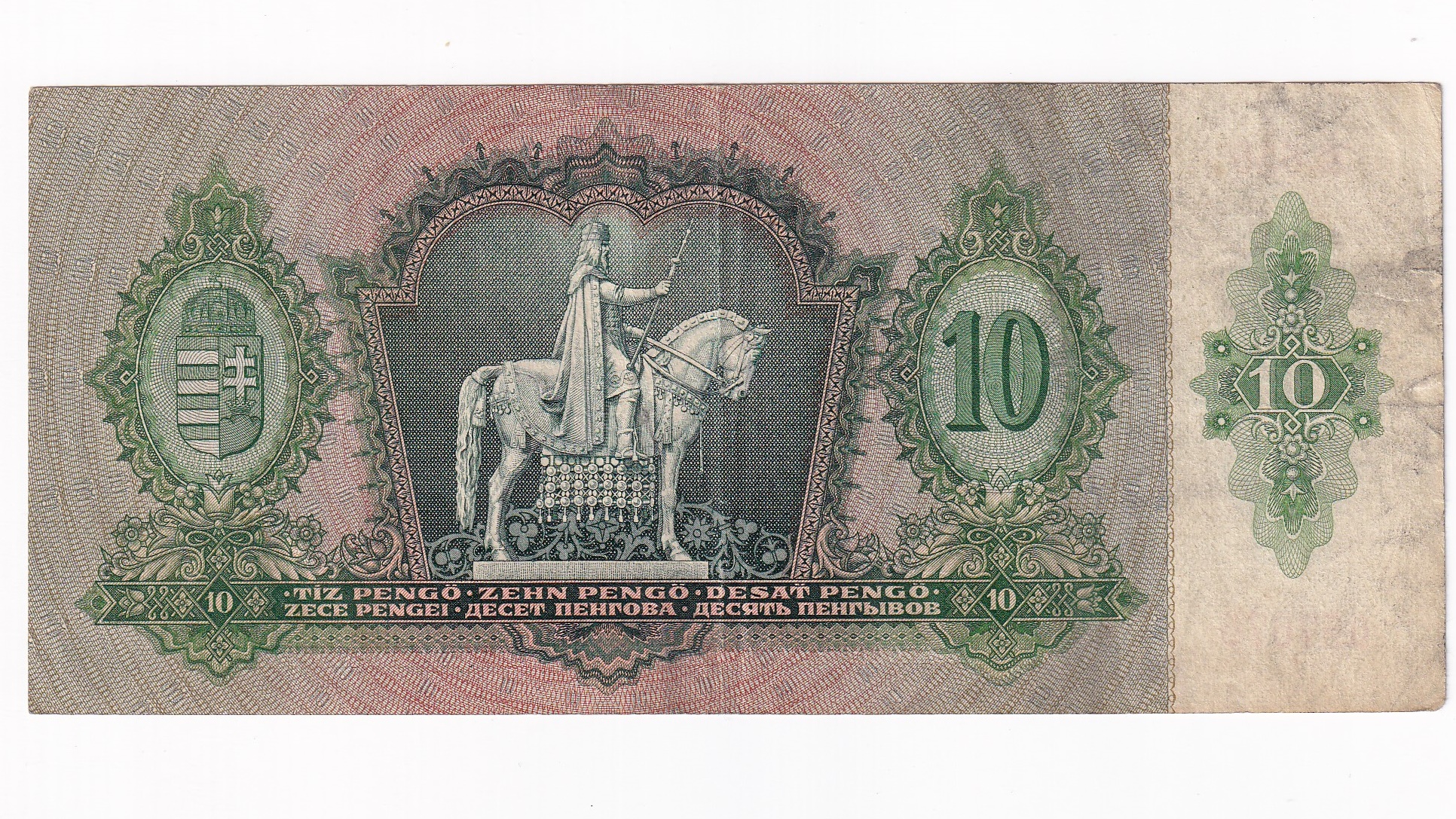 Stará, obehová bankovka Maďarska v hodnote 10 Pengo z roku 1936.