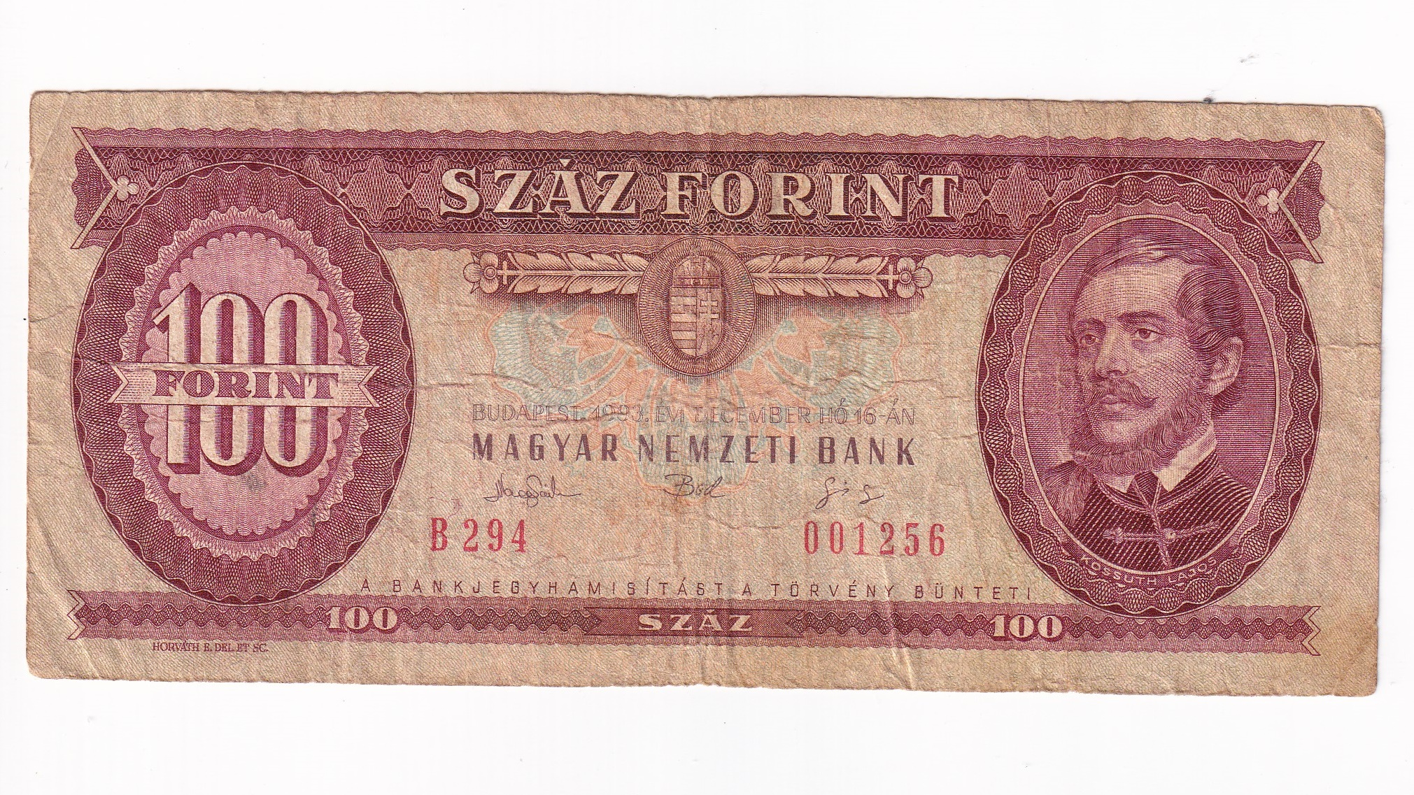 Maďarsko 100 Forint 1993. Séria B294 001256. Stará, obehová bankovka Maďarska v hodnote 100 Forint z roku 1993 – Numizmatický obchod