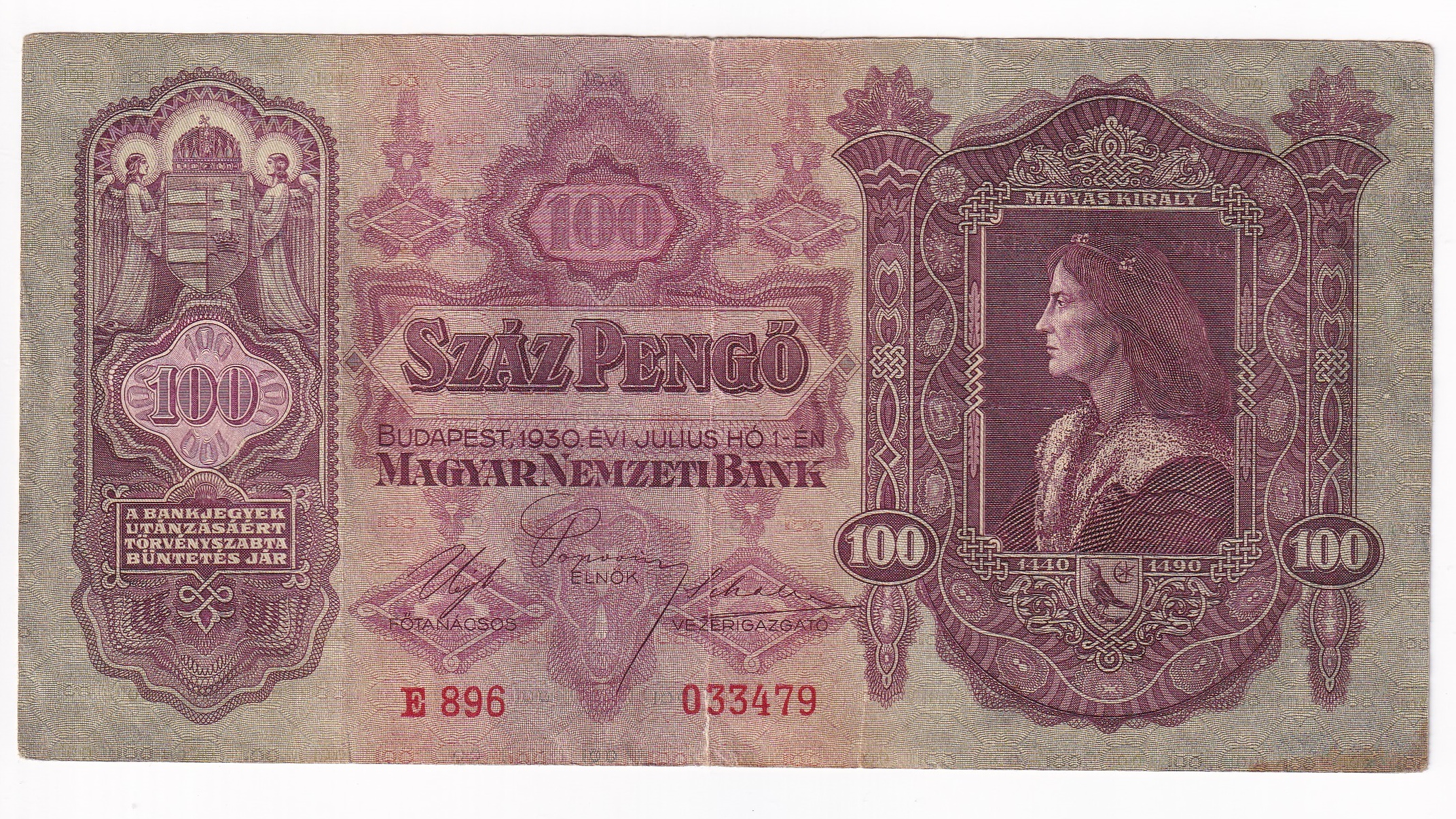 Maďarsko 100 Pengo 1930 E896. Séria E896 033479. Stará, obehová bankovka Maďarska v hodnote 100 pengo z roku 1930 – Numizmatický obchod
