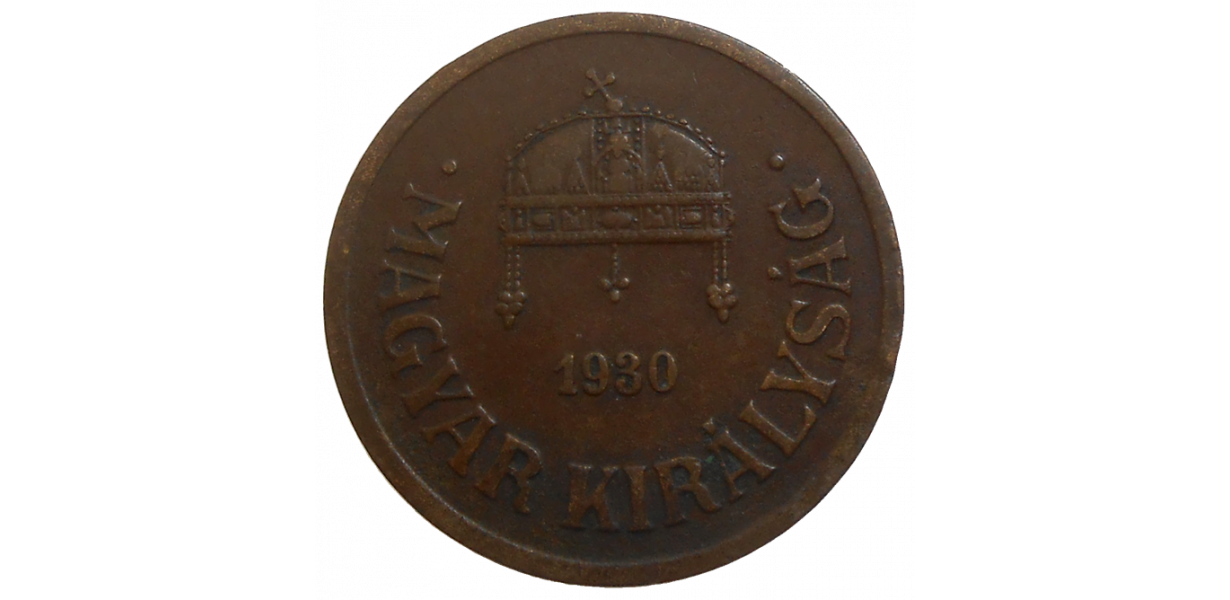 Stará, bronzová, obehová minca Maďarska v hodnote 2 Fillérov z roku 1930.