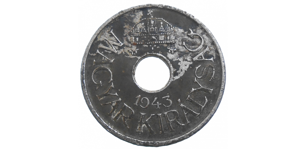 Stará, železná, obehová minca Maďarska v hodnote 20 Fillérov z roku 1943.