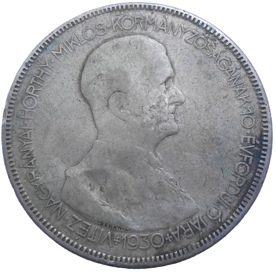 Stará, strieborná, obehová minca Maďarska v hodnote 5 pengo z roku 1930.