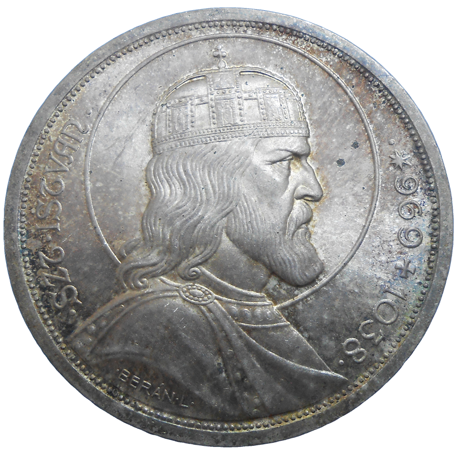 Stará, strieborná, obehová minca Maďarska v hodnote 5 pengo z roku 1938 – 900. výročie úmrtia svätého Štefana.