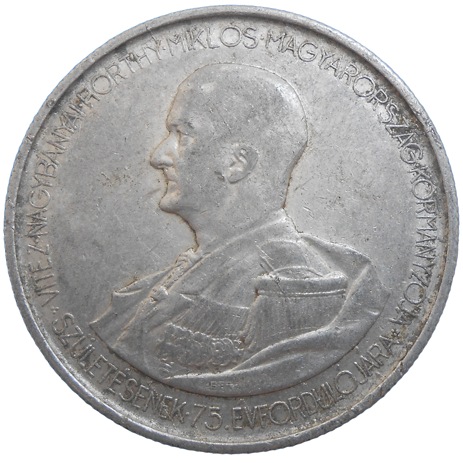Stará, hliníková, obehová minca Maďarska v hodnote 5 Pengő z roku 1943.