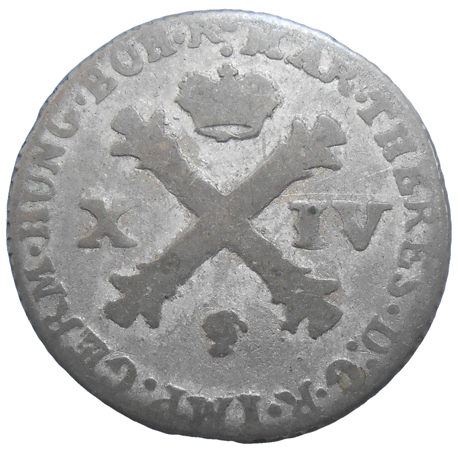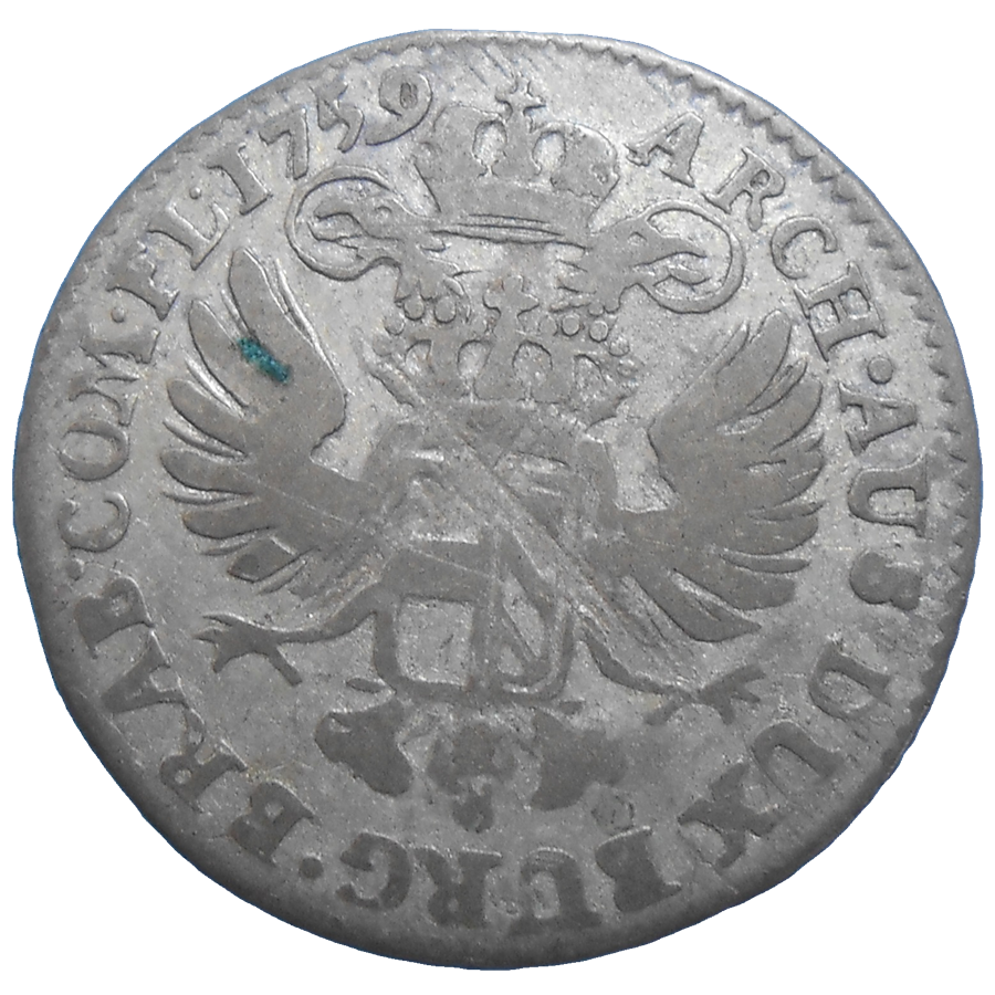 Stará, strieborná, obehová minca Márie Terézie v hodnote XIV Liard z roku 1759.