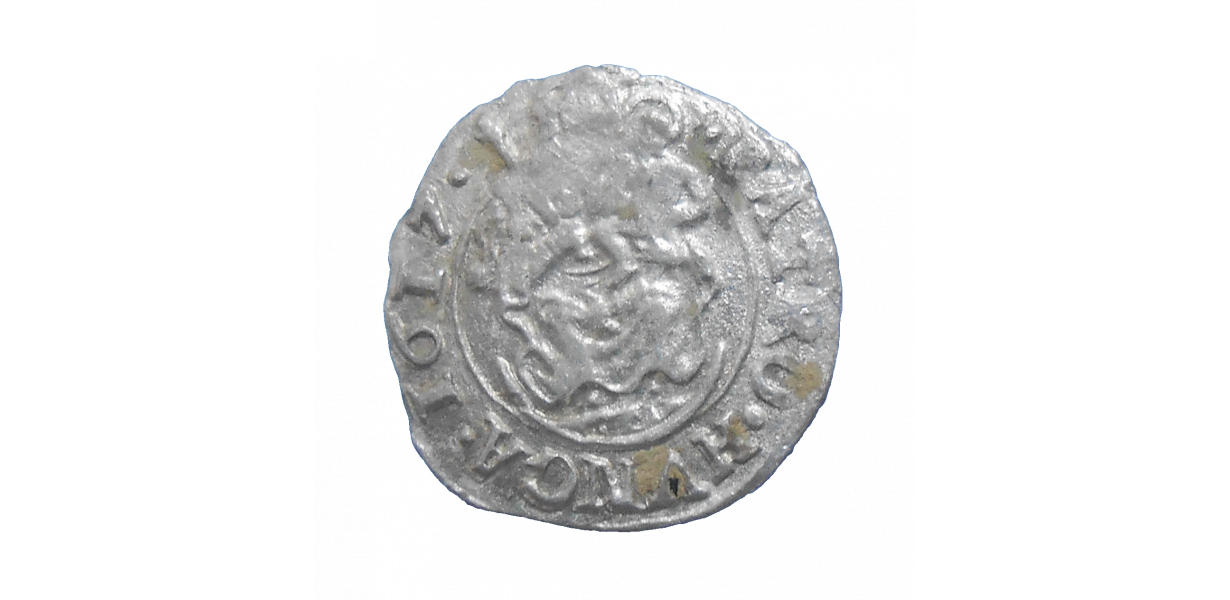 Stará, strieborná, obehová minca Mateja II. Habsburského v hodnote denáru z roku 1617.