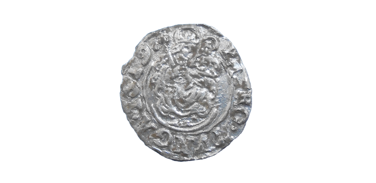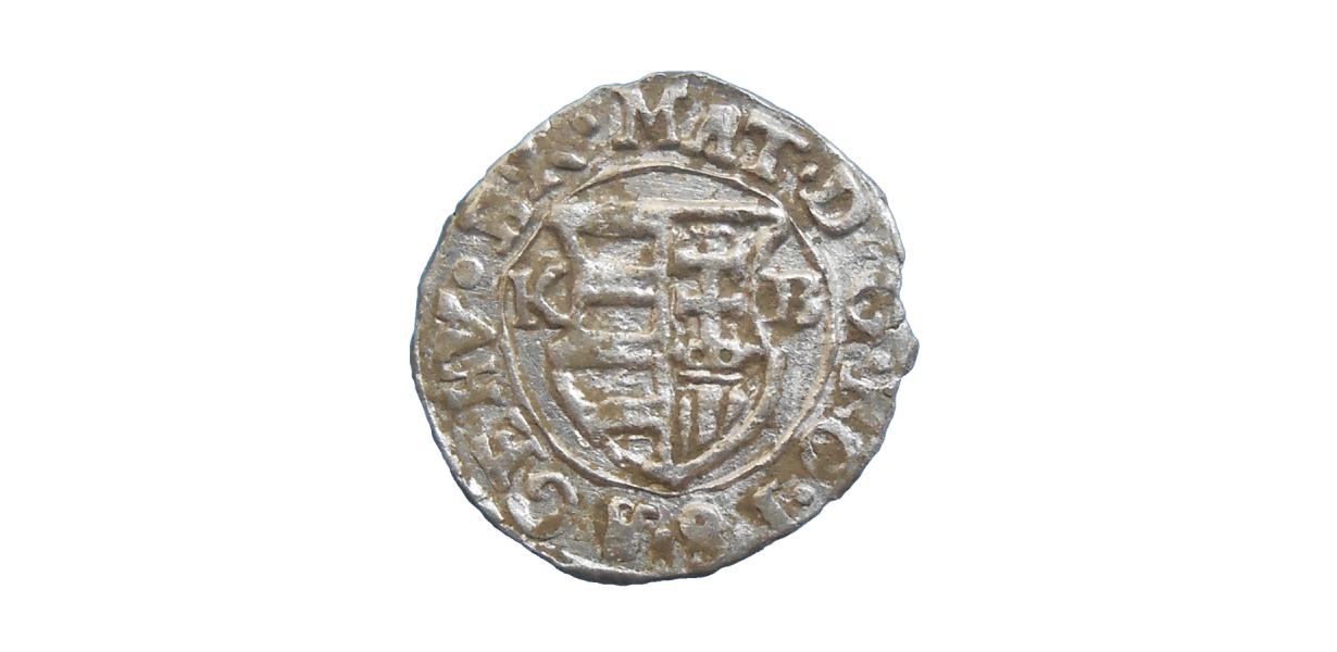 Stará, strieborná, obehová minca Mateja II. Habsburského v hodnote denáru z roku 1619.