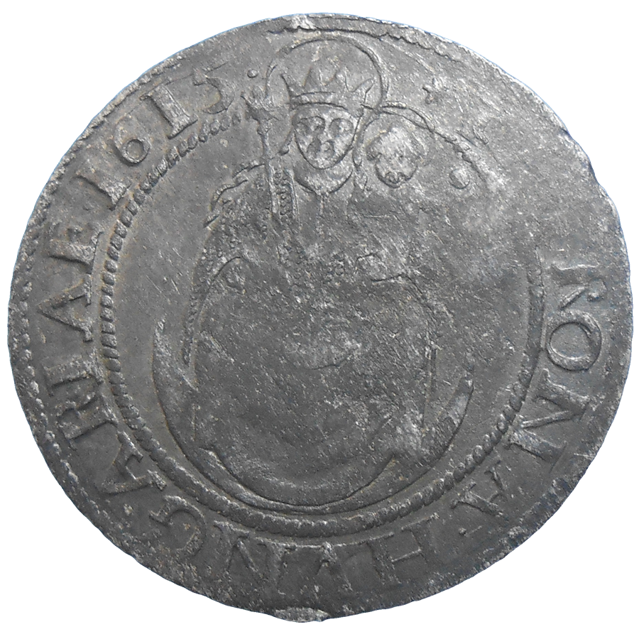 Stará, strieborná, obehová minca Mateja II. Habsburského v hodnote grošu z roku 1615.