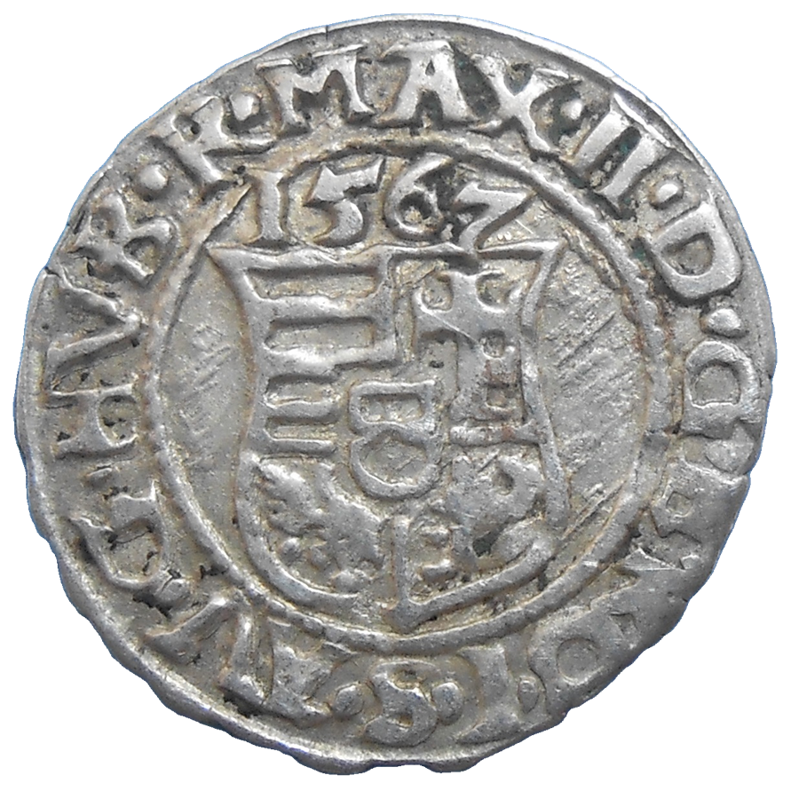 Maximilián II. Denár 1567 KB. Stará, strieborná, obehová minca Maximiliána II. Habsburského v hodnote denáru z roku 1567 – Numizmatický obchod