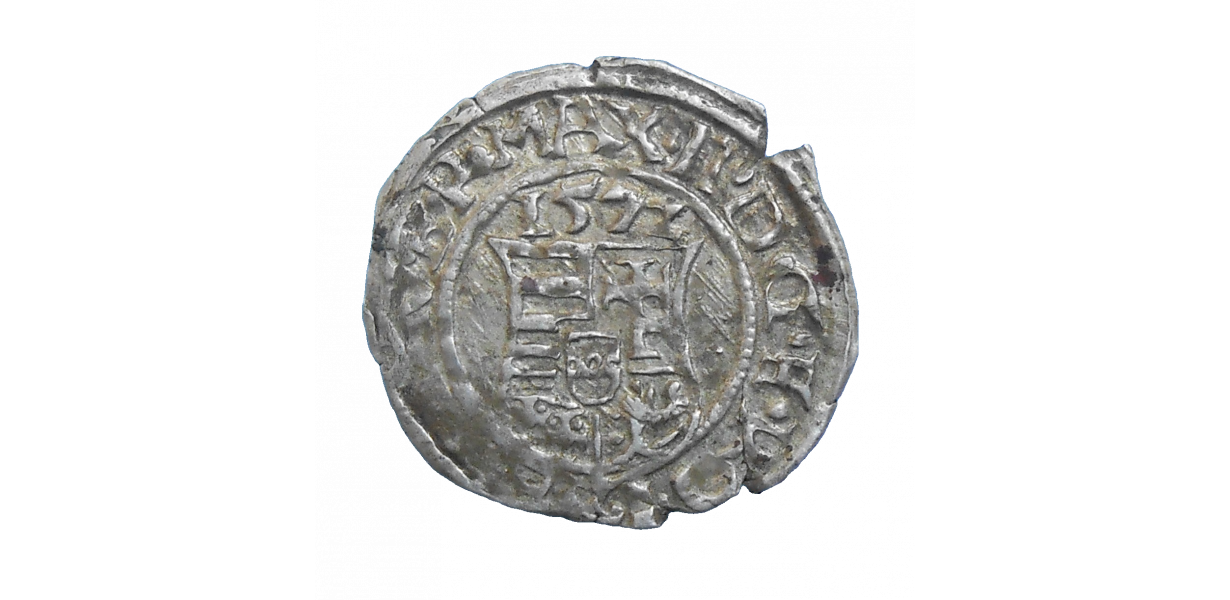 Stará, strieborná, obehová minca Maximilián II. Habsburského v hodnote denáru z roku 1572.