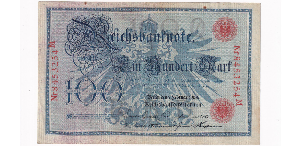 Stará, obehová bankovka Nemeckého cisárstva v hodnote 100 Mariek z roku 1908.