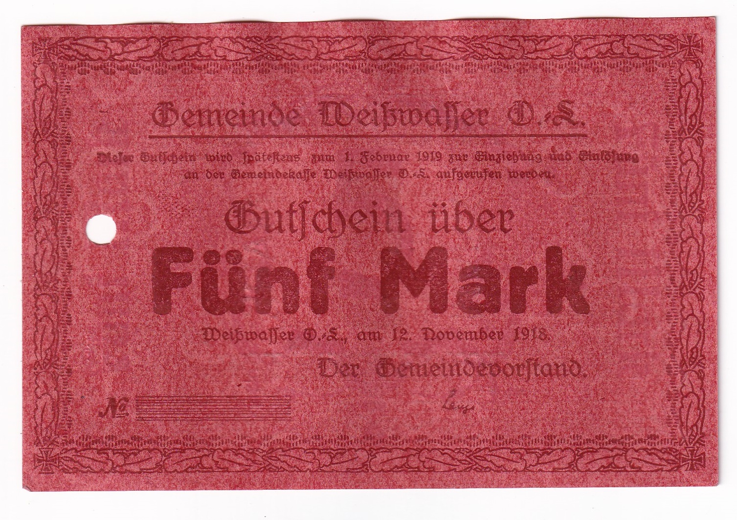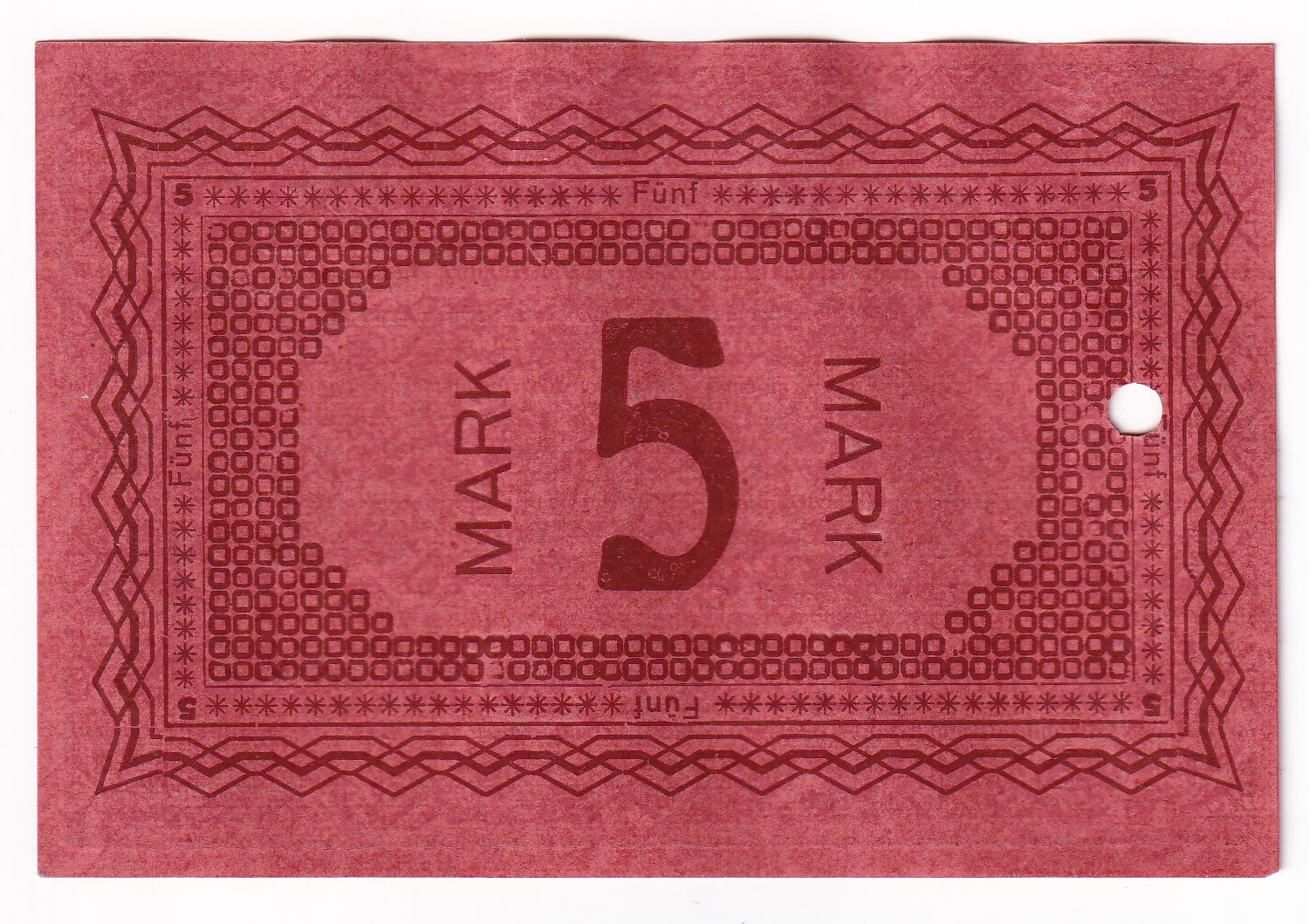 Stará, núdzová, obehová bankovka Nemecka v hodnote 5 mariek z roku 1918.