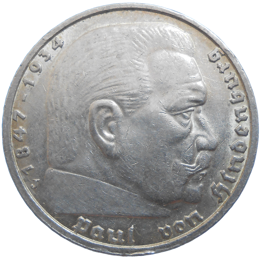 Stará, strieborná, obehová minca Nemecka v hodnote 5 mariek z roku 1937.