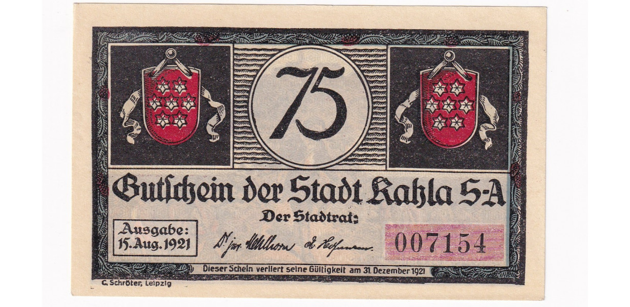 Stará, núdzová bankovka, Notgeld, mesta Kahla v hodnote 75 Pfennigov z roku 1921.