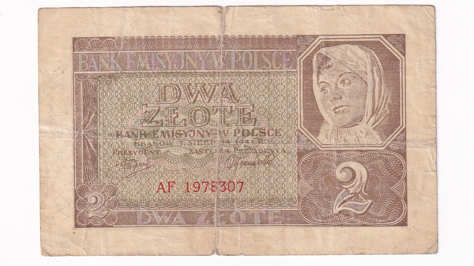 Poľsko 2 Zlote 1941 AF. Séria AF 1978307. Stará, obehová bankovka Poľska v hodnote 2 Zlote z roku 1941 – Numizmatický obchod