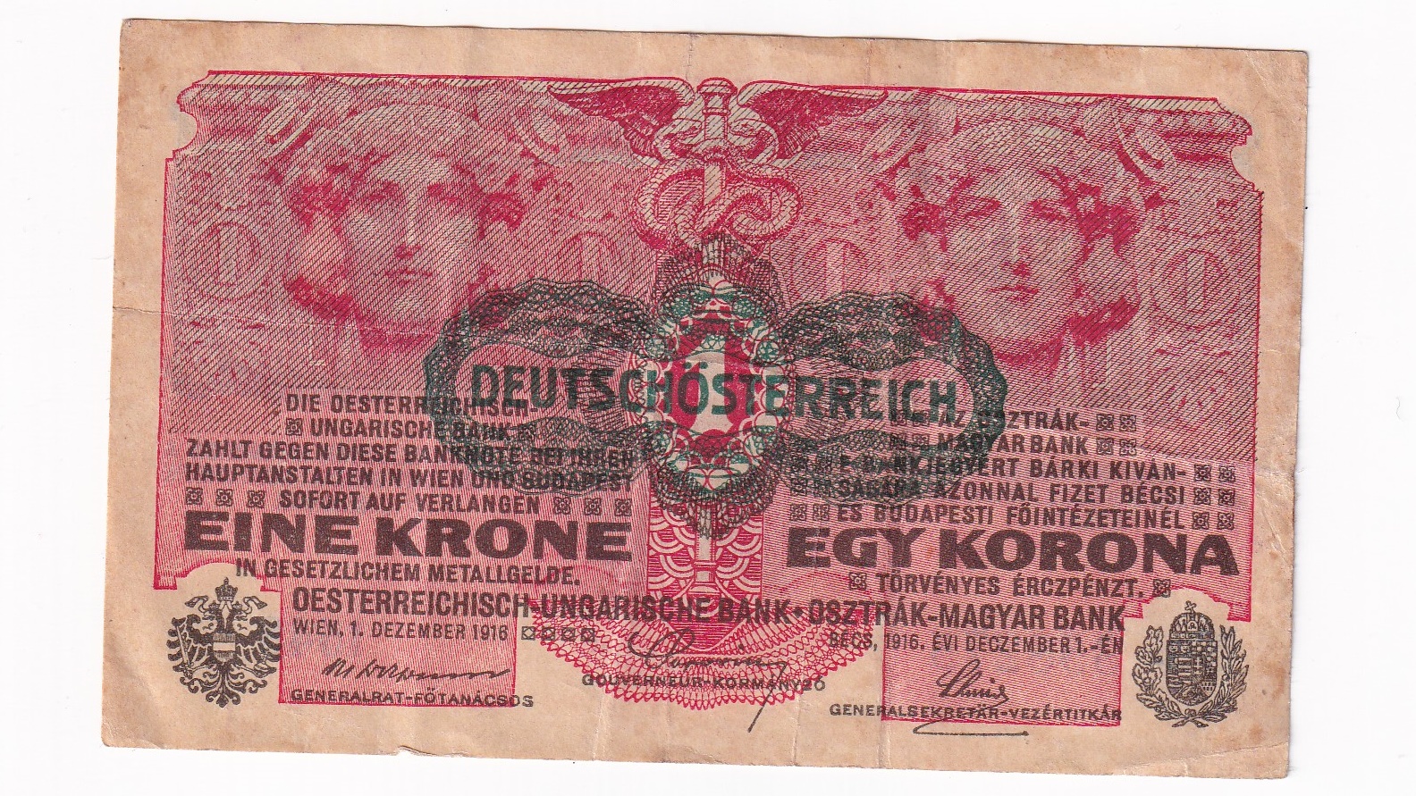 Stará, obehová bankovka Rakúska v hodnote 1 koruny z roku 1916 – pretlač Deutschosterreich.