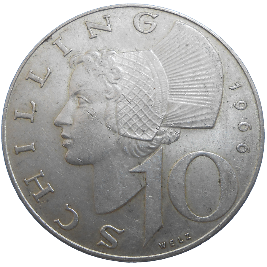 Stará, strieborná, obehová minca Rakúska v hodnote 10 Schillingov z roku 1966.