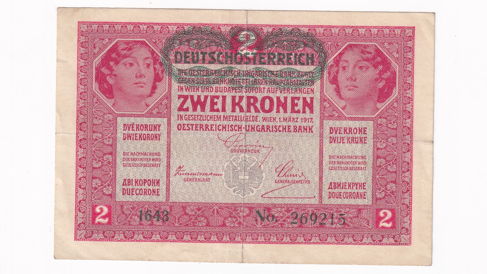 Rakúsko 2 Kronen 1917. Séria 1643 269215. Stará, obehová bankovka Rakúsko-Uhorska v hodnote 2 korún s pretlačou Rakúska – Numizmatický obchod