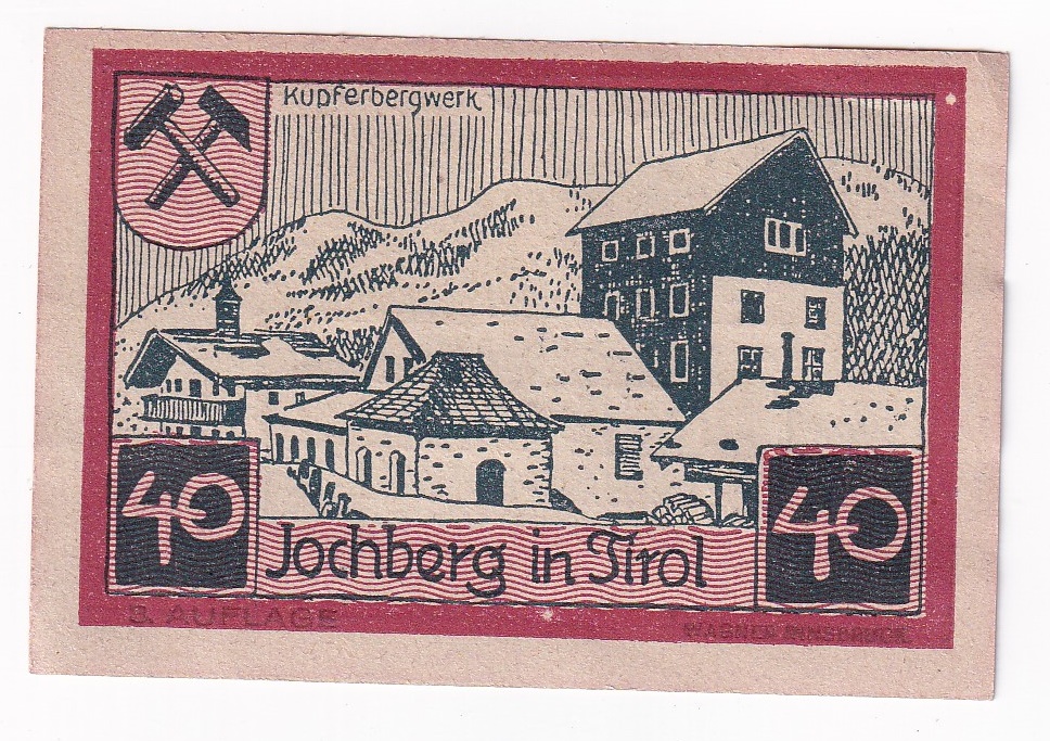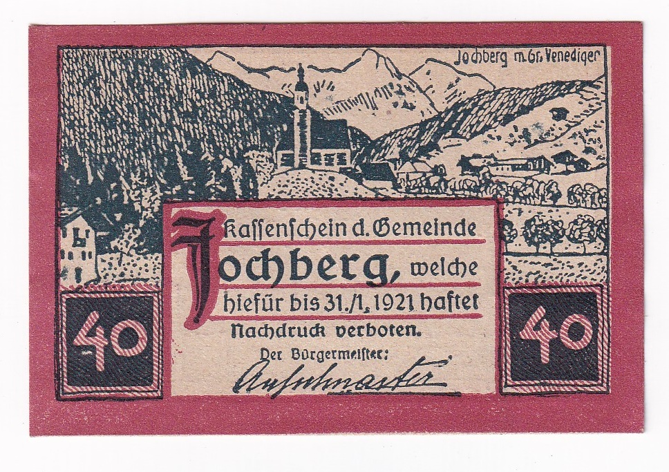 Stará, obehová núdzová bankovka Rakúska v hodnote 40 heller z roku 1921.