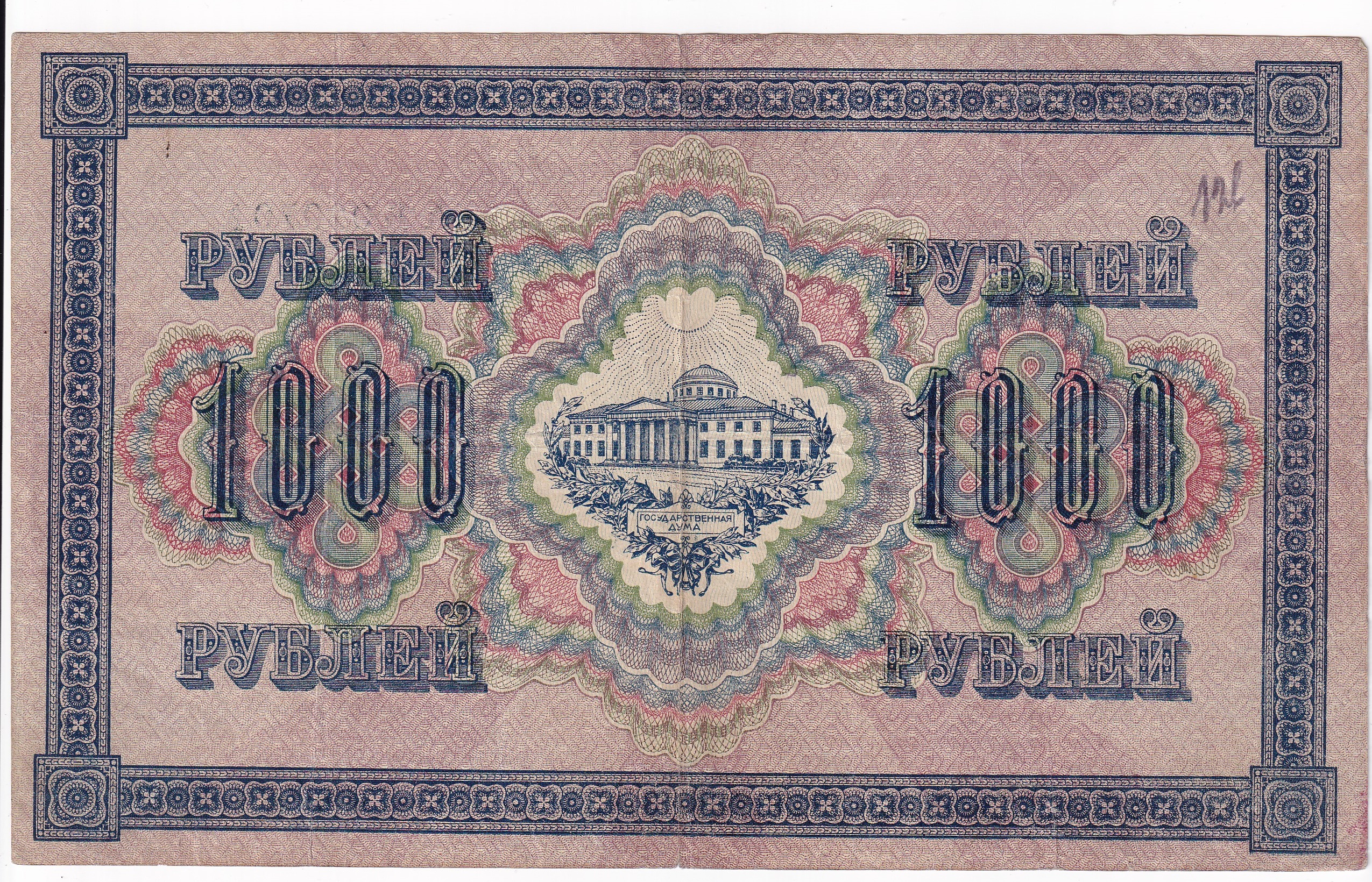Stará, obehová bankovka Ruska v hodnote 1000 rubľov z roku 1917.