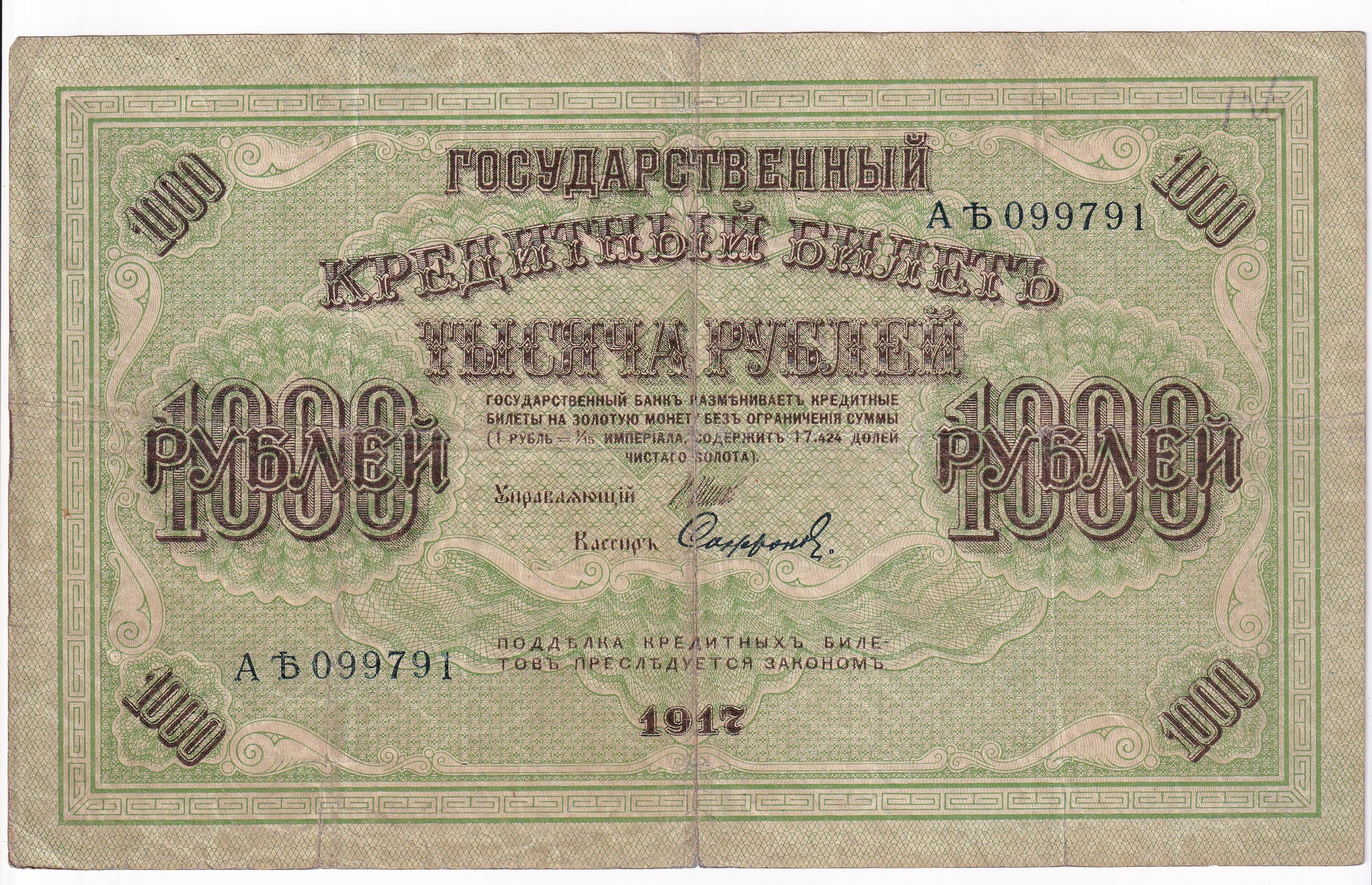 Rusko 1000 Rubľov 1917. Séria AB 099791. Stará, obehová bankovka Ruska v hodnote 1000 rubľov z roku 1917 – Numizmatický obchod